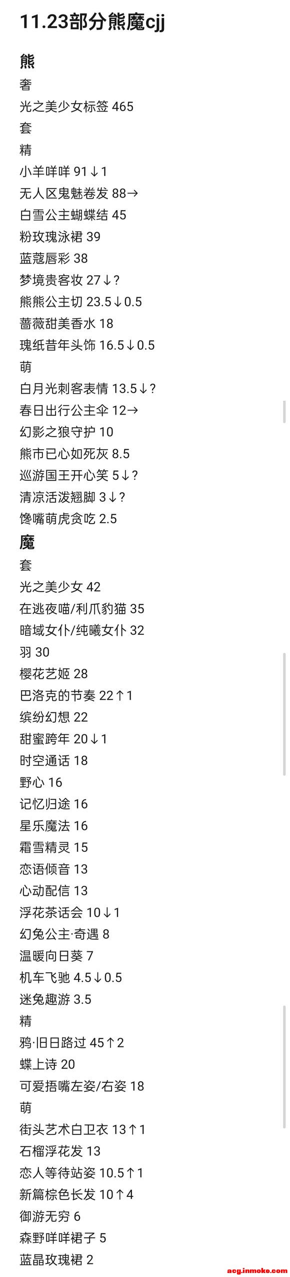 rt 本帖价格仅来自11.23当日未表明低/小低/手速收出帖内cjj 并非绝对市价 已按价格高低分类并从高到低排序且提供了部分物品与上次记录的涨幅程度 仅供参考 熊