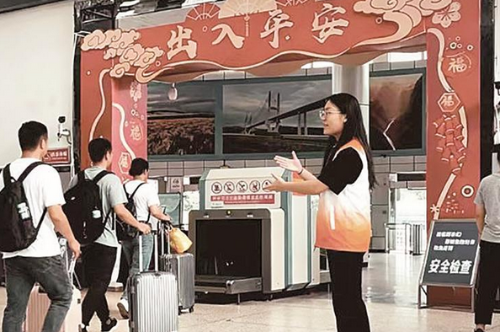 青年志愿者在市客运中心引导旅客进站乘车。 (团市委供图)